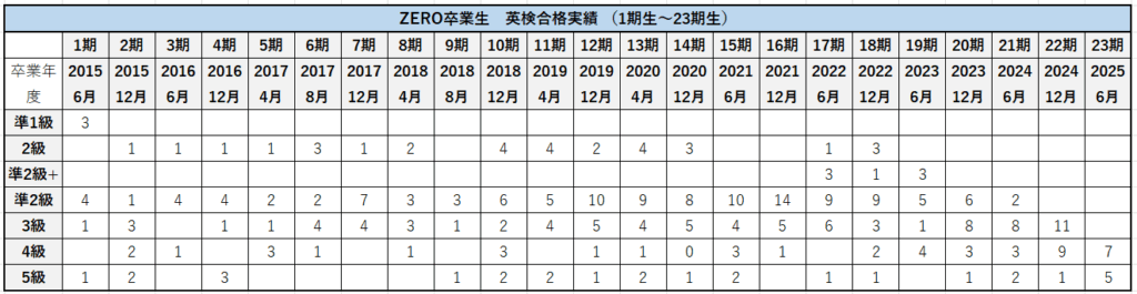 ZERO卒業生 英検合格実績 (1期生〜23期生)